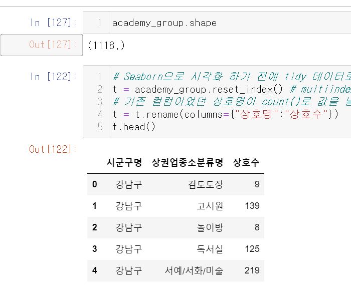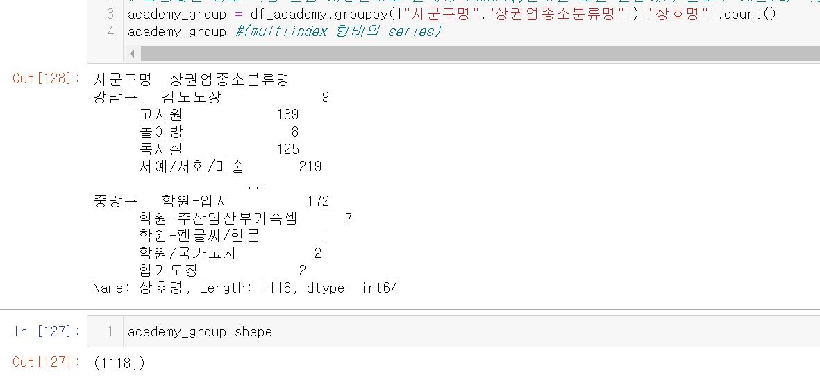 "academy_group의 shape는  (1118,)로 컬럼이 나오질 않는데.. reset_index()한 후 보여지는 표에서는 multiindex 였던 "시군구명","상권업종소분류명" 뿐만아니라 '상호수(상호명)'도 컬럼이 나오는 부분에서 의문이었던 것이에요.."