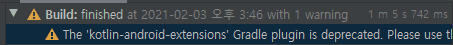 The 'kotlin-android-extensions' Gradle plugin is deprecated. Please use this migration guide (https://goo.gle/kotlin-android-extensions-deprecation) to start working with View Binding (https://developer.android.com/topic/libraries/view-binding) and the 'kotlin-parcelize' plugin.