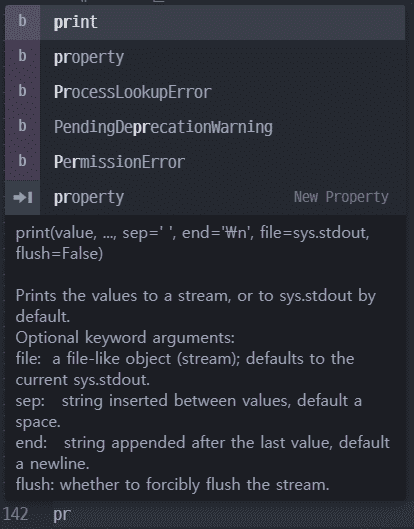 print를 작성하는데 autocomplete-python 패키지가 있는 경우