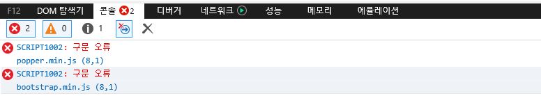 아마도 popper.min.js에 사소한 구문 오류가 있는 것 같습니다. 우리가 남이 만든 popper.min.js를 수정하기는 어려운 상황이니 너그럽게 넘어가는 것이 좋을 것 같습니다. 사이트 동작에 큰 문제가 있는 것이 아니라면 말이죠.