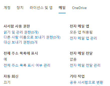 >> 복수 인원이 기존 사용자의 메일을 받도록 설정하기 위해서는 기존 사용자의 메일을 [공유 사서함]으로 전환하고 공유 사서함에 함께 메일을 받을 인원을 공유 사서함의 구성원으로 넣어주시면 됩니다. 공유 사서함으로 변환하는 것은 해당 사용자 클릭 후 [메일] 탭에 보시면 기타 작업에 있습니다.