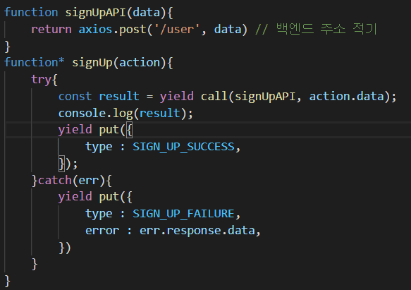 회원가입 하는 쪽 axios 코드가 어떤걸 말씀하시는지 잘 모르겠습니다ㅜㅜ 일단 이 코드는 routes안 user 코드에서 회원가입할 때 실행되는 코드입니다.