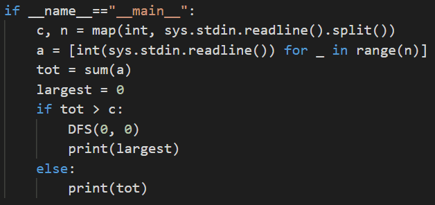 마찬가지로 이번 바둑이 문제에서도 바둑이 몸무게의 전체 합이 무게 제한에 걸릴 경우에만 DFS를 호출하도록 작성했습니다. 그래서 Time-Exceeded 문제가 발생하는지 모르고 DFS 함수 내에서 Cut-Edge Tech를 적용하지 않았습니다.