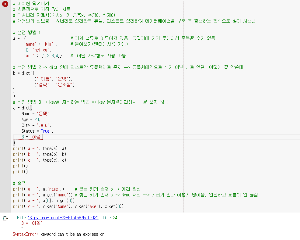 이렇게 코딩을 해봣는데 3번째 방법으로 딕셔너리를 선언하면 key는 int 형태로 할수 없는건가요?