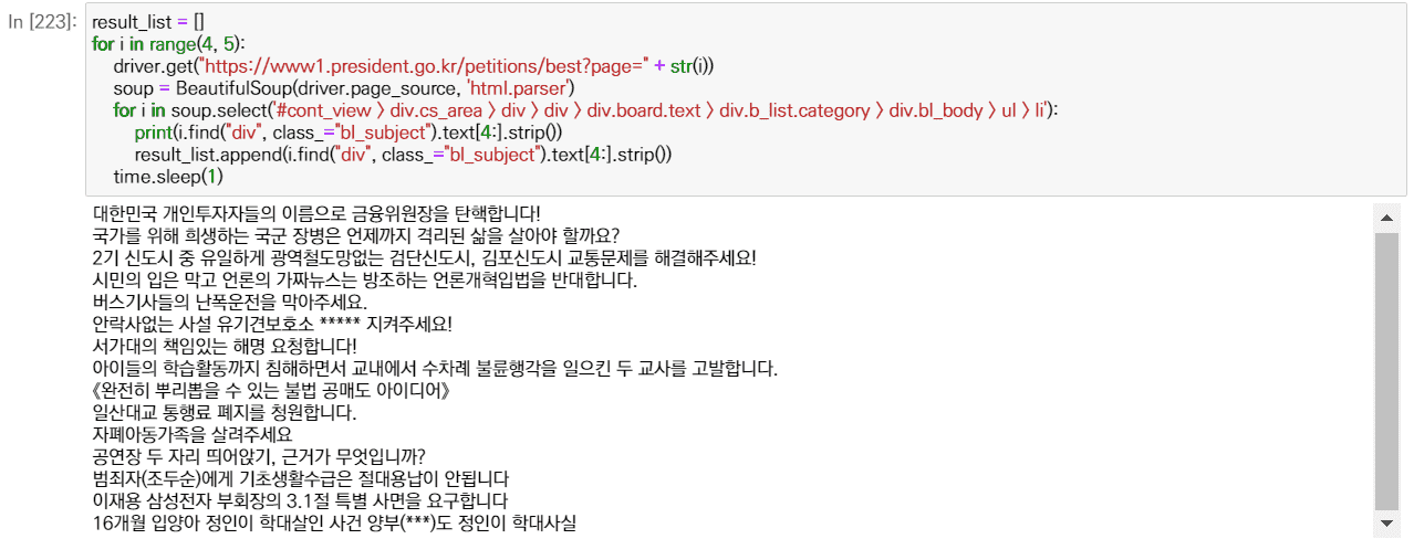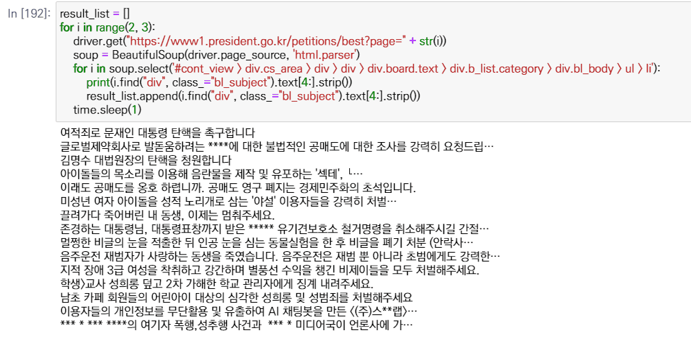 result_list.append("아이돌들의 목소리를 이용해 음란물을 제작 및 유포하는 '섹테', …")를 넣었을 때는 정상 작동하다가