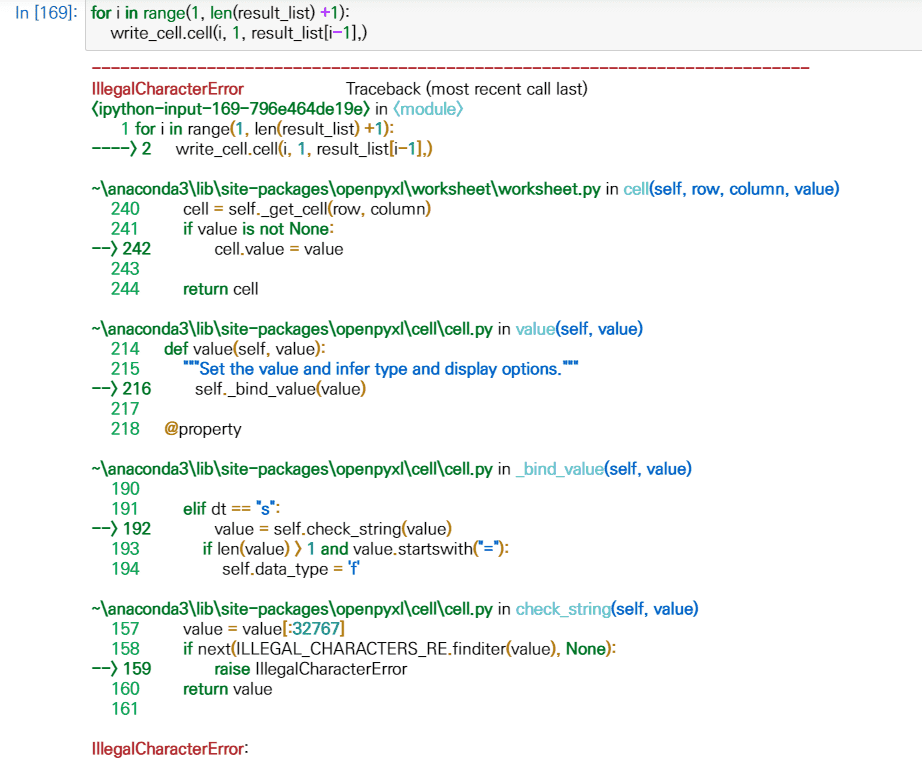write_cell.cell(i, 1, result_list[i-1],) 부분을 돌릴때 나오는 오류이고요