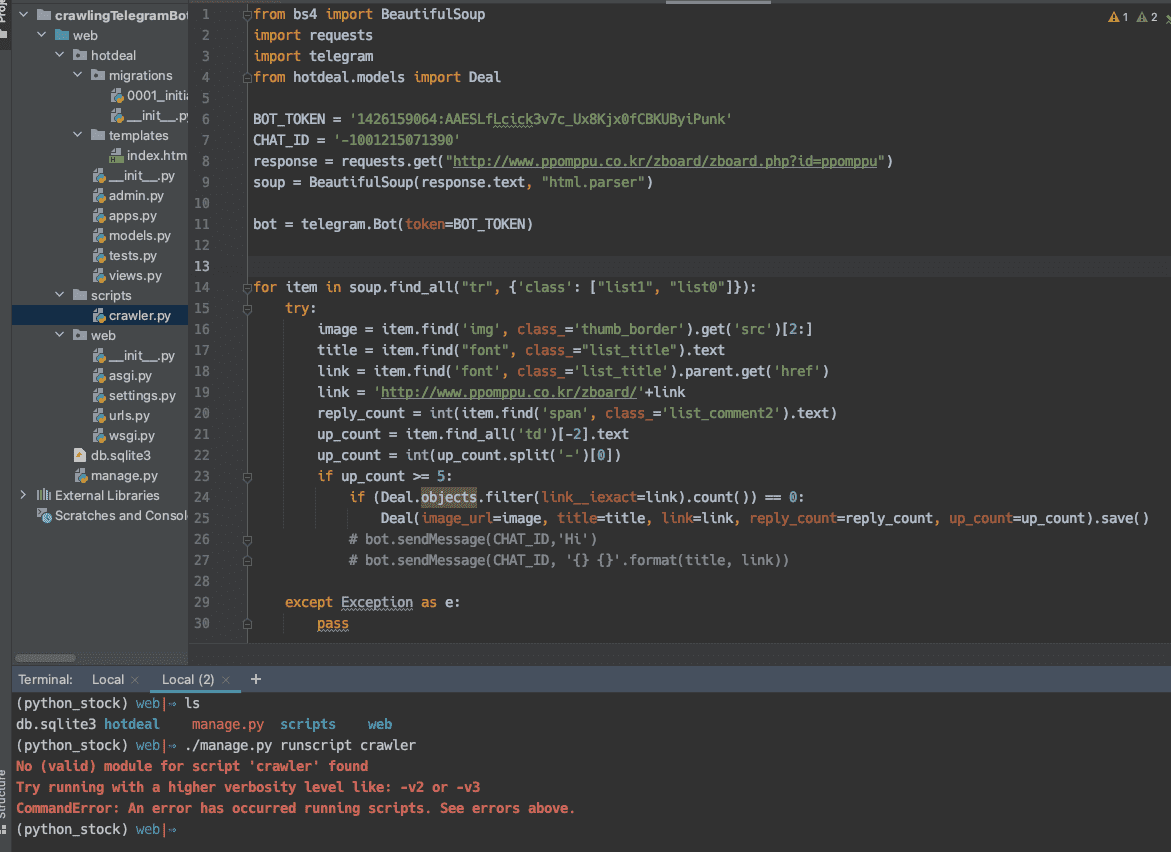 해결하신거죠?^^ 전체 소스코드는 https://github.com/jinsyu/hotdeal 이 주소로 가시면 확인하실 수 있습니다!