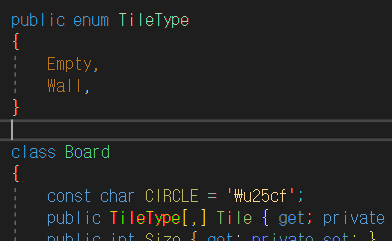 제가 궁금한 점은 Board _board로 선언했을 때, enum TileType부분이 public으로 Board class안에 들어있음에도 _board.TileType.Empty와 같은 참조가 불가능하다는 점입니다.