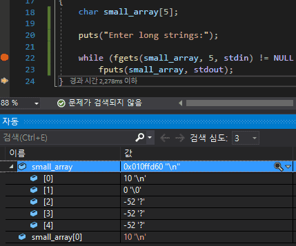 따라서 엔터만 치시면 fgets 자체는 NULL을 리턴하는게 아니라 small_array를 리턴하고 small_array[0]에 '\n'이 들어오게 되므로 small_array[0] 은 '\n'이 됩니다. small_array는 크기가 5인 배열이니 [ '\n' '\0' 쓰레기 쓰레기 쓰레기 ] 이런 모양이 되겠네요 !