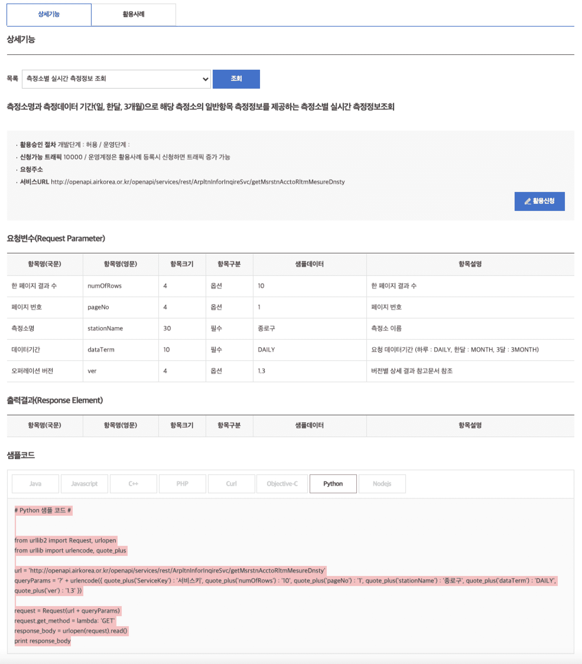 지금 정부 공공데이터 포털에서는 개발가이드 버튼탭이 없어서 요청주소와 python 샘플코드를 어디서 찾을 수 있을지 잘 모르겠습니다.