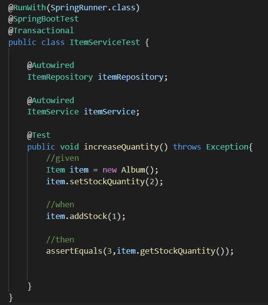 아래 코드는 상품 기능 중에 addStock 메소드를 테스트하기 위해 작성한 코드입니다.
