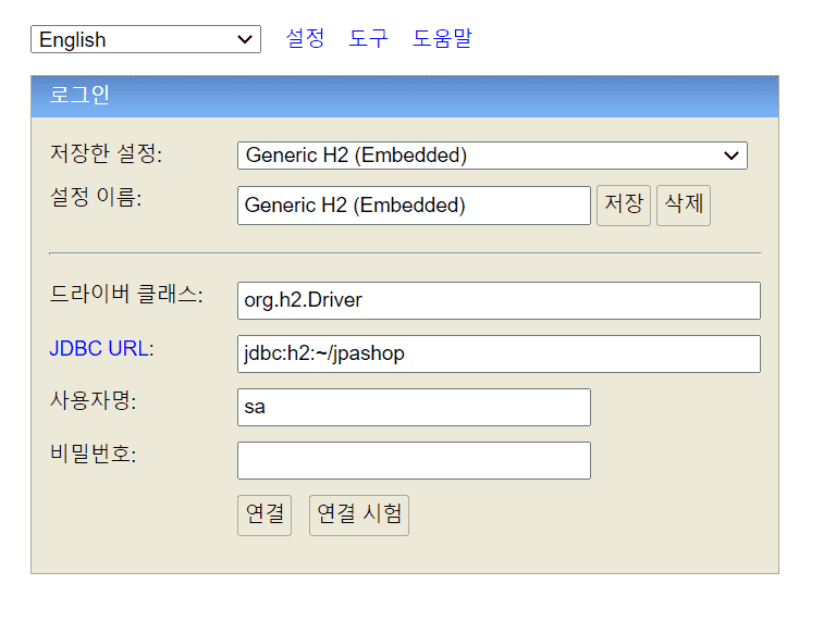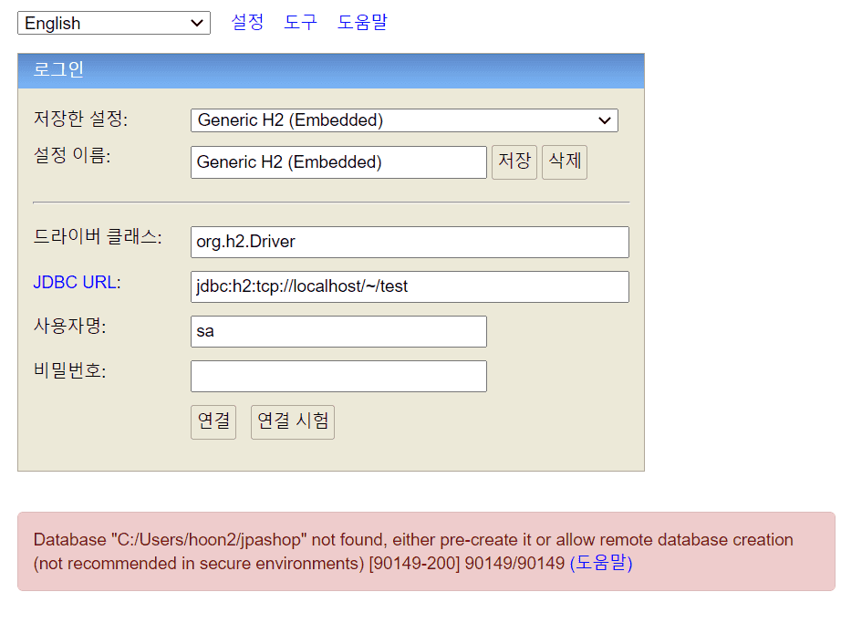 스프링 입문 강의 때 ~/test.mv.db 을 생성했었는데 이번에 ~/jpashop.mv.db을 생성하려고 아래 이미지 처럼 jdbc:h2:~/jpashop을 입력하고 연결하려니까 다음과 같이 뜹니다 ㅠㅠ