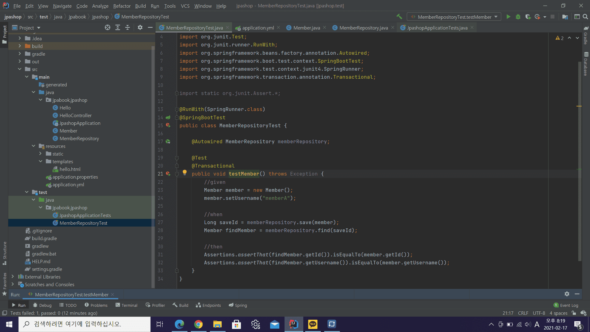 MemberRepositoryTest 코드 질문이요!