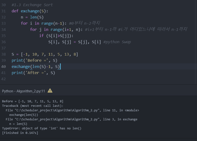 1.1알고리즘 이란 에서 교환정렬 파이썬으로 바꿀때