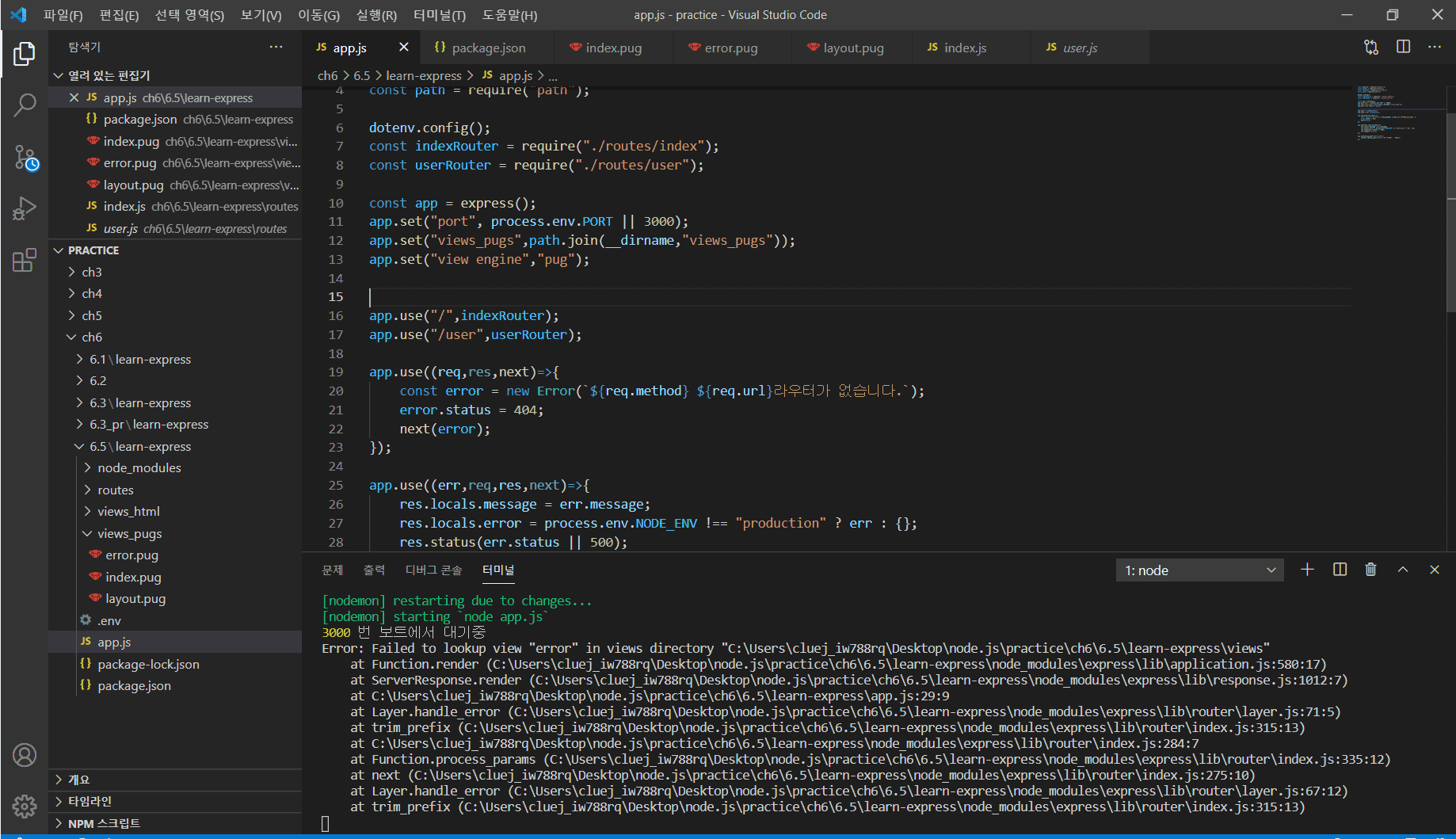 안녕하세요! 열심히 수강중인 수강생입니다. 수강을 하다가 views_pugs views_html로 구분하여 이 6.5절을 실습을 하던 와중 이상한 점이 있어서 질문드립니다. 교안에서는 app.set("views",path.join(~))이런식으로 views폴더를 생성해서 실습을 진행했었는데 views -> views_pugs로 수정하여 넌적스와 구분하기위해 실습을 해보았습니다. 근데 다음사진과 같은 오류가 떠서 다시 views_pugs->views로 수정하였는데 오류가 생기지않고 잘 실행됩니다. 무슨 에러인가요?