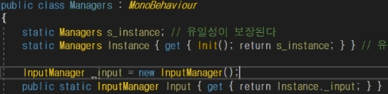 Managers Instance의 초기화는 PlayerController의 Start()함수에서 Instance에 접근할때 혹은 Managers의 Start() 내에서 Init()함수로 이루어질텐데,