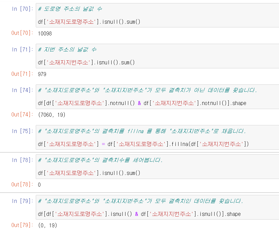 79번 셀은 '소재지도로명주소' 와 '소재지지번주소' 둘 다 결측치인 데이터가 몇 개인지를 구하는 코드입니다.