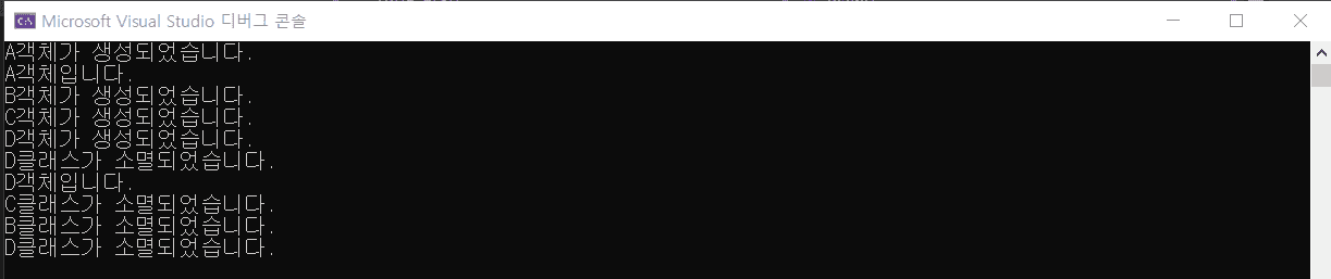 콘솔창에서 "D클래스가 소멸되었습니다." 라고 명시된 것을 확인할 수 있습니다.