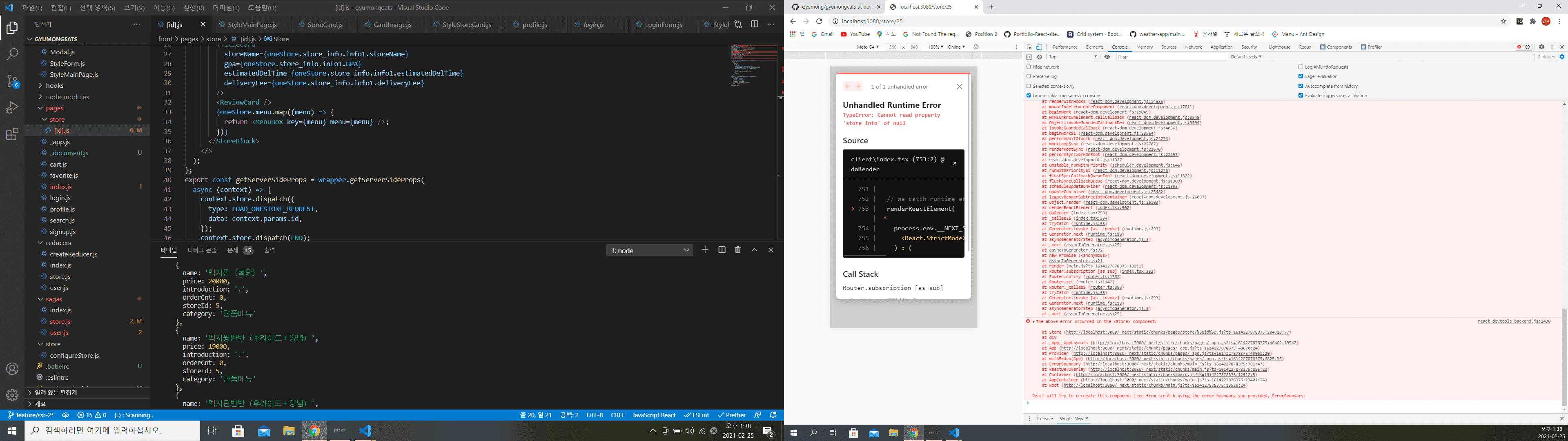 index page에서 link태그로 해당 주소로 이동하면 아래와 같은 오류가 뜹니다. 그러나 해당 페이지에서 새로고침시 정상 작동이 되는데 ssr 과 관련해서 제가 어떤 문제를 겪고있는거 같습니다.. Link 를 타고 들어가면 클라이언트에서 실행되기에 겪는 문제일가요??