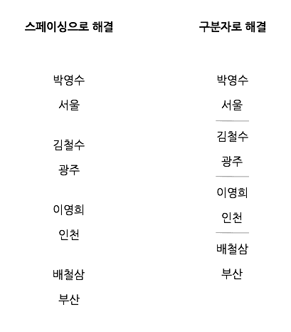 그리고 위에서 구분자 대신 스페이싱 만으로 해결하는 것 역시 가능할 때가 있기 때문에 꼭 구분자를 써야만 한다는 건 아닌 것 같습니다.