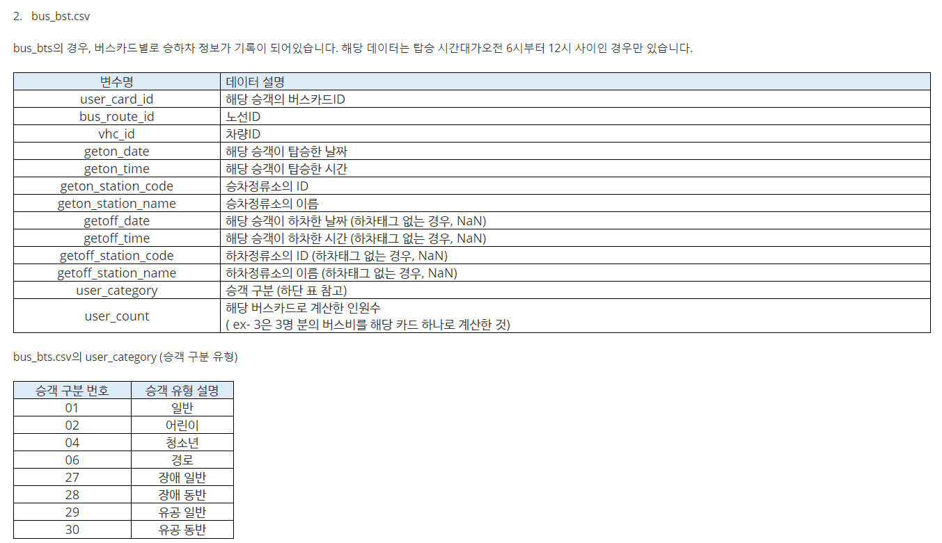 bus.csv를 노선id나 승차/하차 정류소 id로 group by 하면 여러 속성을 만들 수 있습니다.
