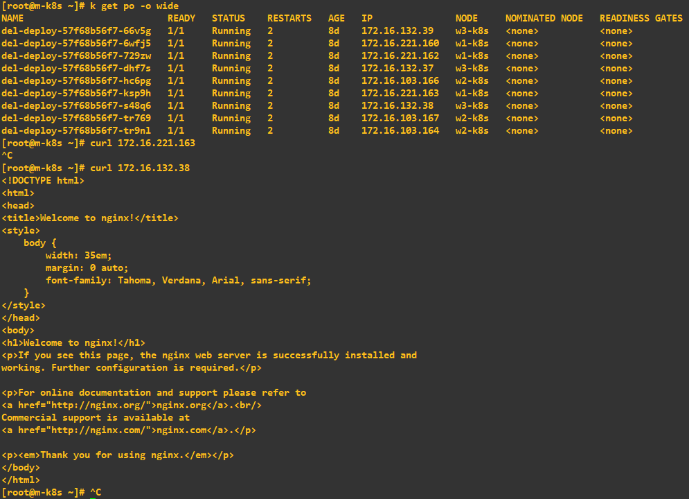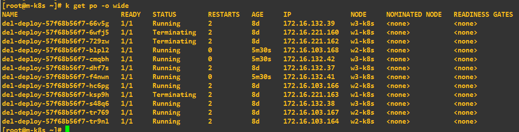 일단 간단하게는 w1-k8s에서 systemctl stop docker를 수행해도 아래와 같이 배포되어 문제가 없는 것처럼 보이지만. 5-6분 정도 지나면 (상태를 파악하고 축출을 결정하는데 걸리는 시간) 아래와 같이 다른 노드에 넘겨진답니다.