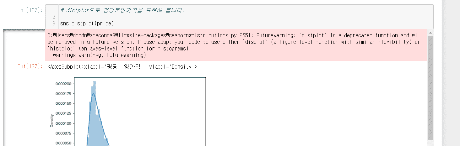 2. 두번째 경고 메시지는 distplot이 앞으로 폐기 예정이니 displot이나 histplot을 대신 사용해 달라는 메시지에요.