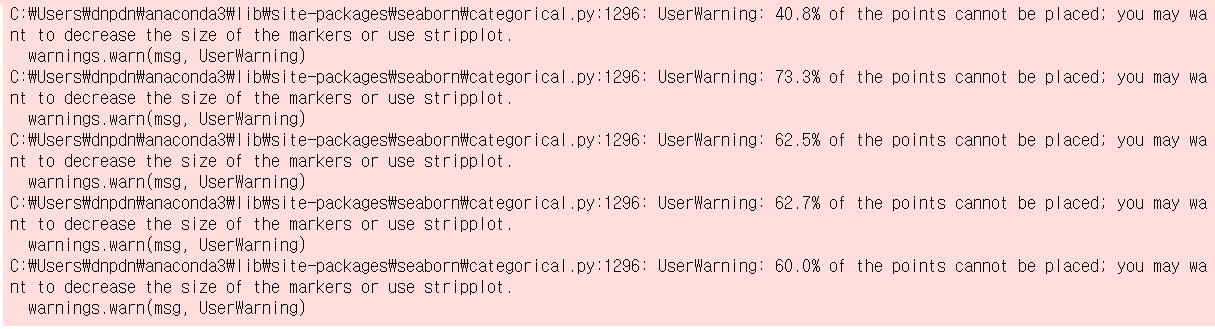 1. 첫번째 경고 메시지는 seaborn 이라는 라이브러리에서 swarmplot을 그릴 때 점이 너무 많은데 제대로 표현할 수 없으니 size 라는 옵션을 사용해서 점의 크기를 줄여보라는 메시지에요.