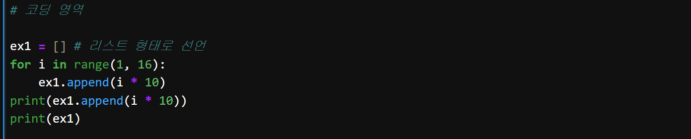 지금과 같은 경우, ex1에 요소를 추가하고 싶다면 단순히 ex1.append(i * 10)만 써주시고, 출력은 print(ex1)으로 리스트 전체를 원하는 시점에 출력하는 것이 좋습니다.