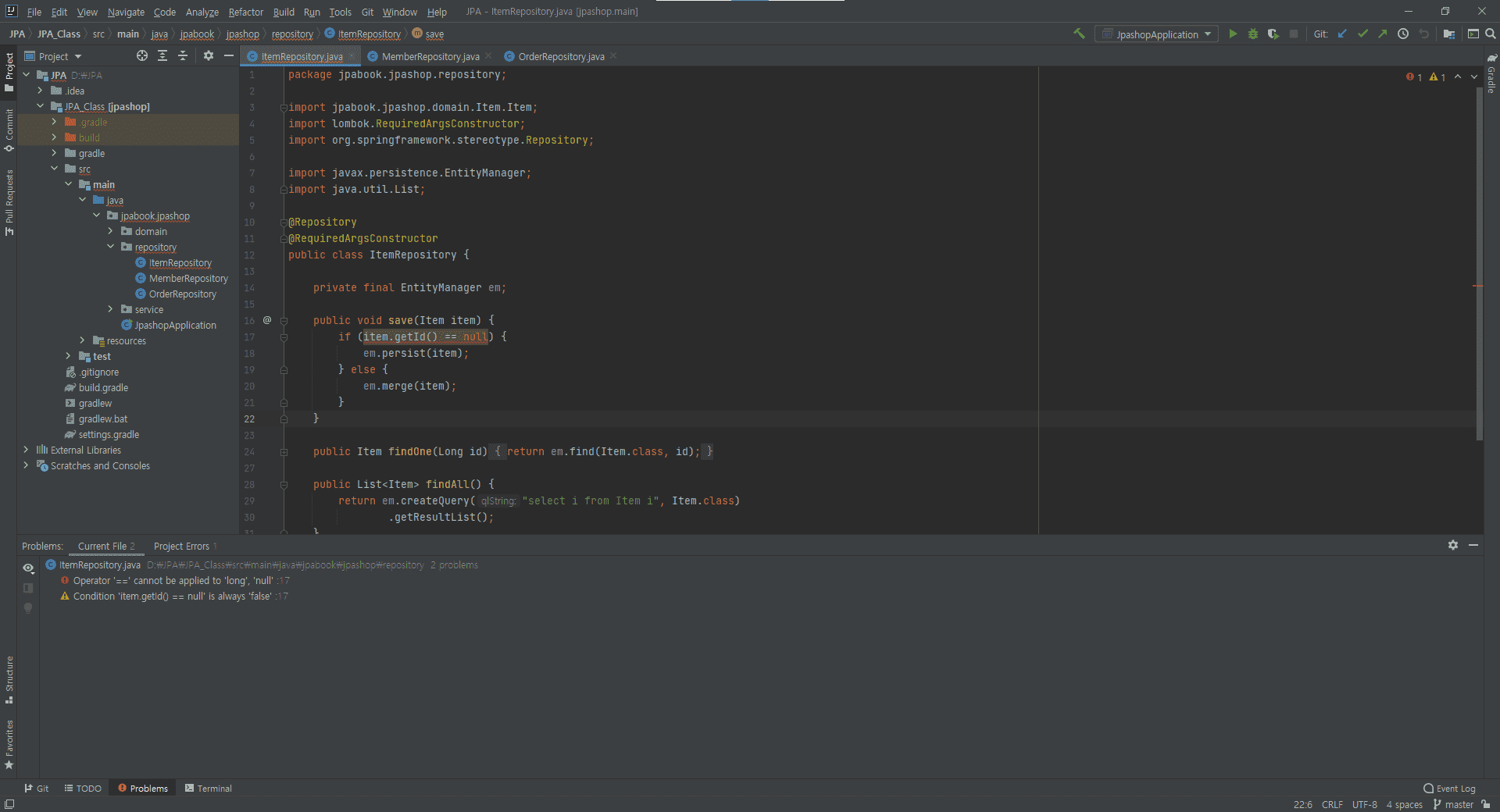 ItemRepository 부분의 save 메소드 안에 Item.getId() == null이 "Operator '==' cannot be applied to 'long', 'null'"오류 메세지가 나옵니다.