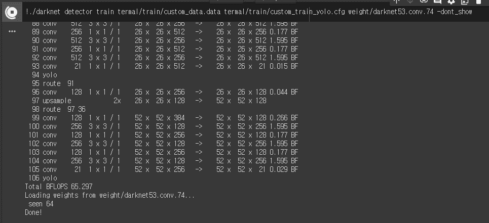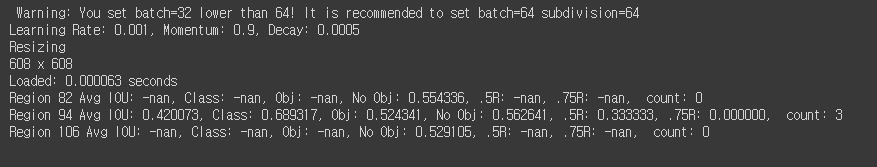 darknet train 시 강의에서 출력되는 값과 달리 사진과 같이 nan 값이 출력됩니다. 공유해주신 강의자료 코드 그대로 돌려도 동일 현상 발생하는데 맞게 진행되고 있는것인지, 만약 잘못된 것이라면 어느부분을 수정하면 될지 확인 가능하실까요? 강의시 colab cudnn version과 현재 version 11.0 이 다르다는 것 외에는 차이가 없어보입니다.