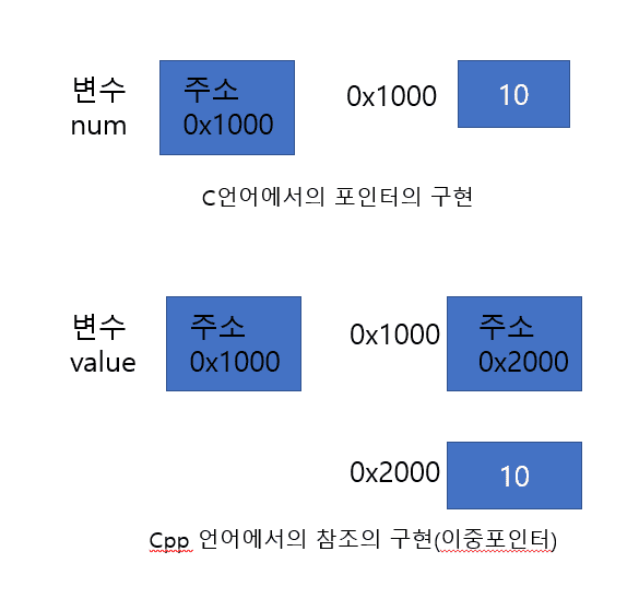 그림을 보시면 참조의 경우 변수 value 에서 두번을 따라가야 실제 데이터를 찾아들어갈 수 있습니다.