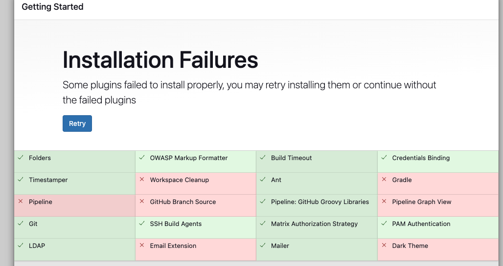 • Retry 옵션: 설치 중 실패한 경우, 젠킨스 관리 페이지에서 ‘Retry’ 옵션을 사용하여 플러그인 설치를 다시 시도할 수 있습니다.