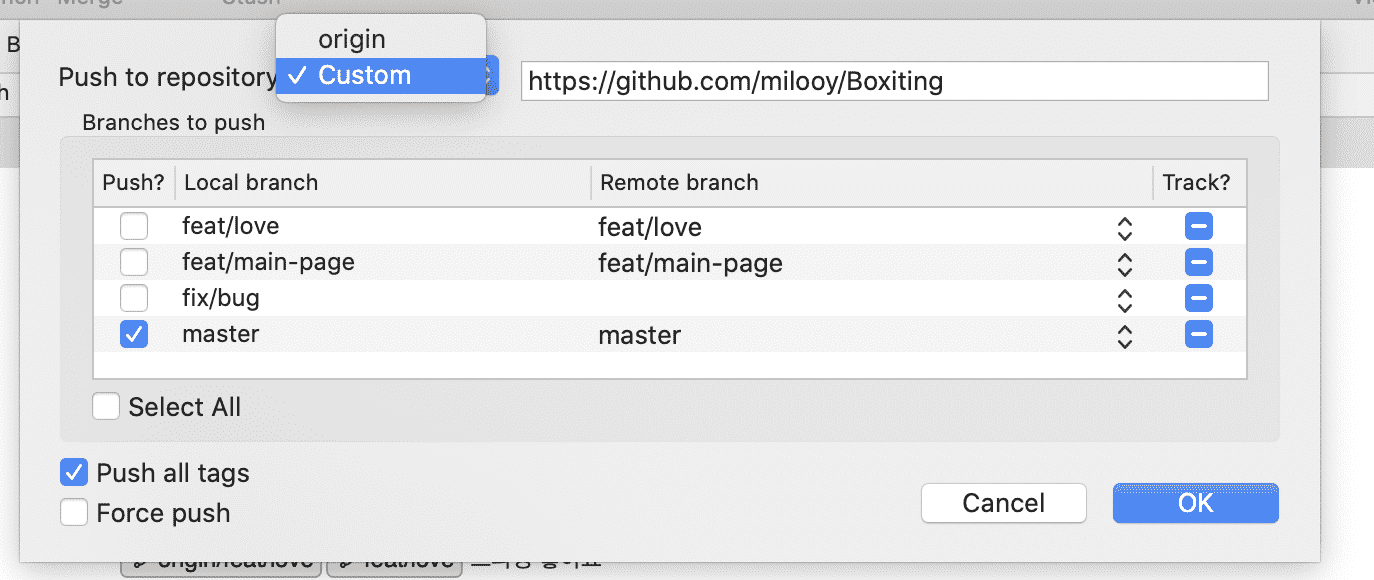 커스텀 옆에 test 대신 재권님(성함 맞으신가요)의 저장소 주소를 적어보시겠어요?