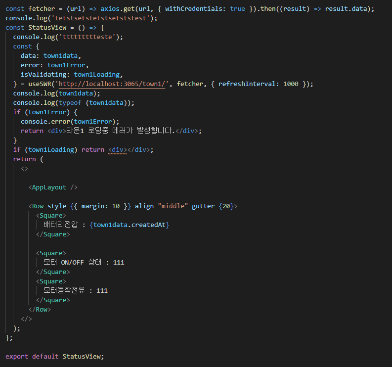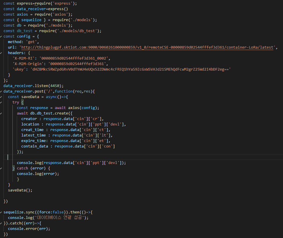 여기서 문제가 생겼습니다. 데이터가 들어올때마다 data_receiver.post가 반응하여 그 아래에 db관련 함수들이 동작만 하는 것이었습니다. 쉽게 말해 data_receiver.post가 제대로된 동작을 하지 않았지만, 그 동작에 따라 그냥 그 아래에 config에 설정된 주소로 axios가 가져온 데이터를 db가 나누어서 데이터를 저장하는 것이었습니다.