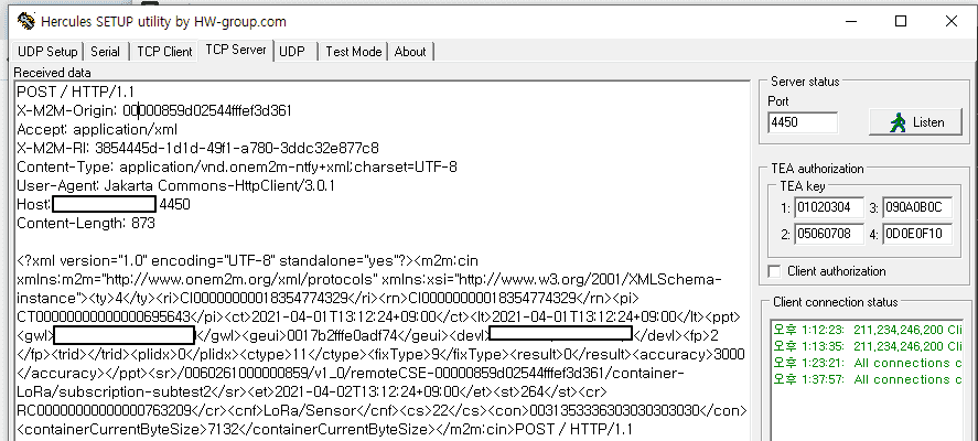 데이터가 잘 들어오는지에 대한 부분은 Hercules 라는 프로그램을 통해서 TCP 서버 포트 4450로 잘 들어오는 것을 확인하였습니다. 아래에 들어오는 관련 스샷을 첨부하겠습니다.