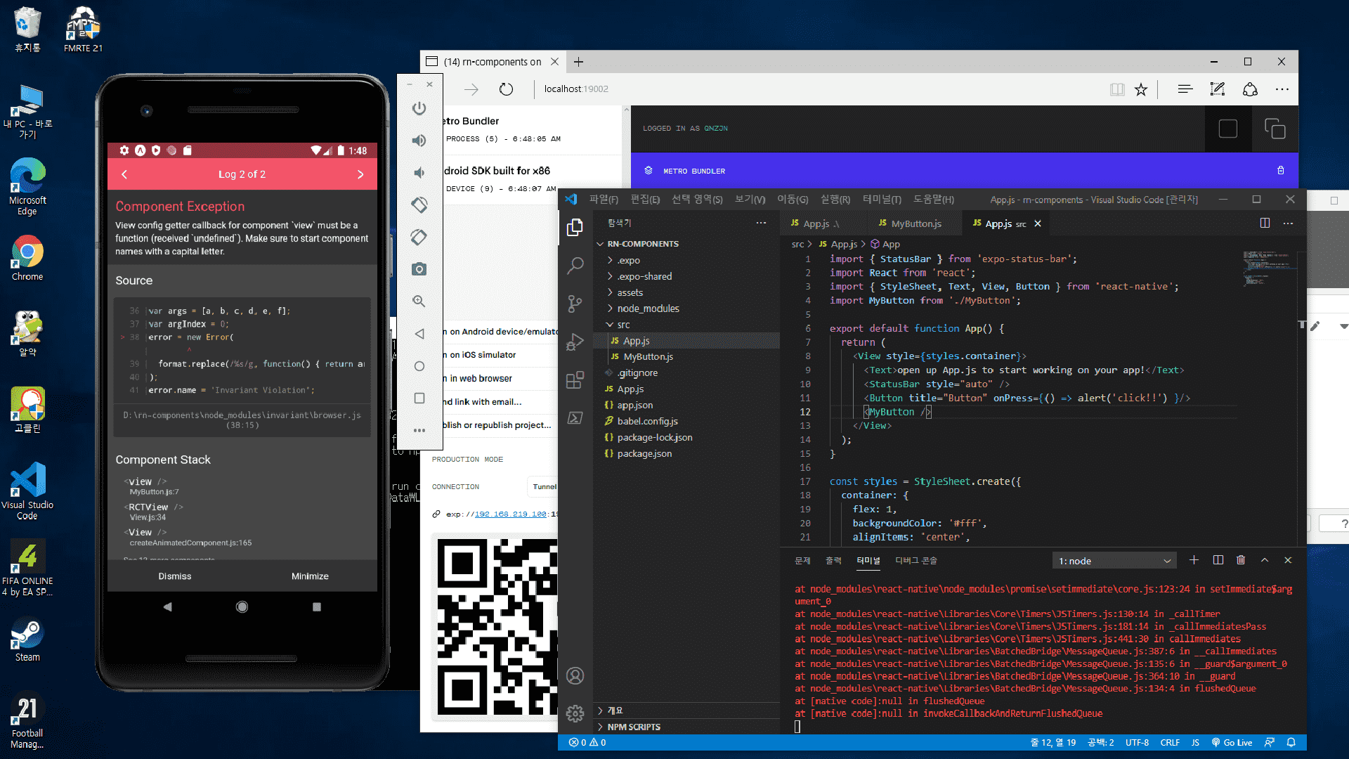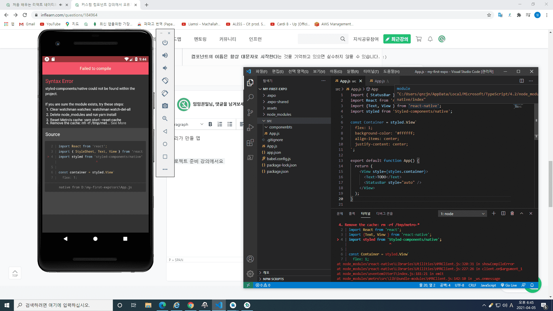 3. 문제의 에러 메시지 입니다. 에러 메시지를 보면, rn-tod/src/App.js 로 되어 있는 것으로 보아, 프로젝트 이름은 rn-tod로 만드셨고, src 폴더 안에 App.js 파일이 있는 것으로 예상됩니다. 아마 글에 적으신 위쪽 코드가 App.js 파일의 코드인 것으로 보입니다.