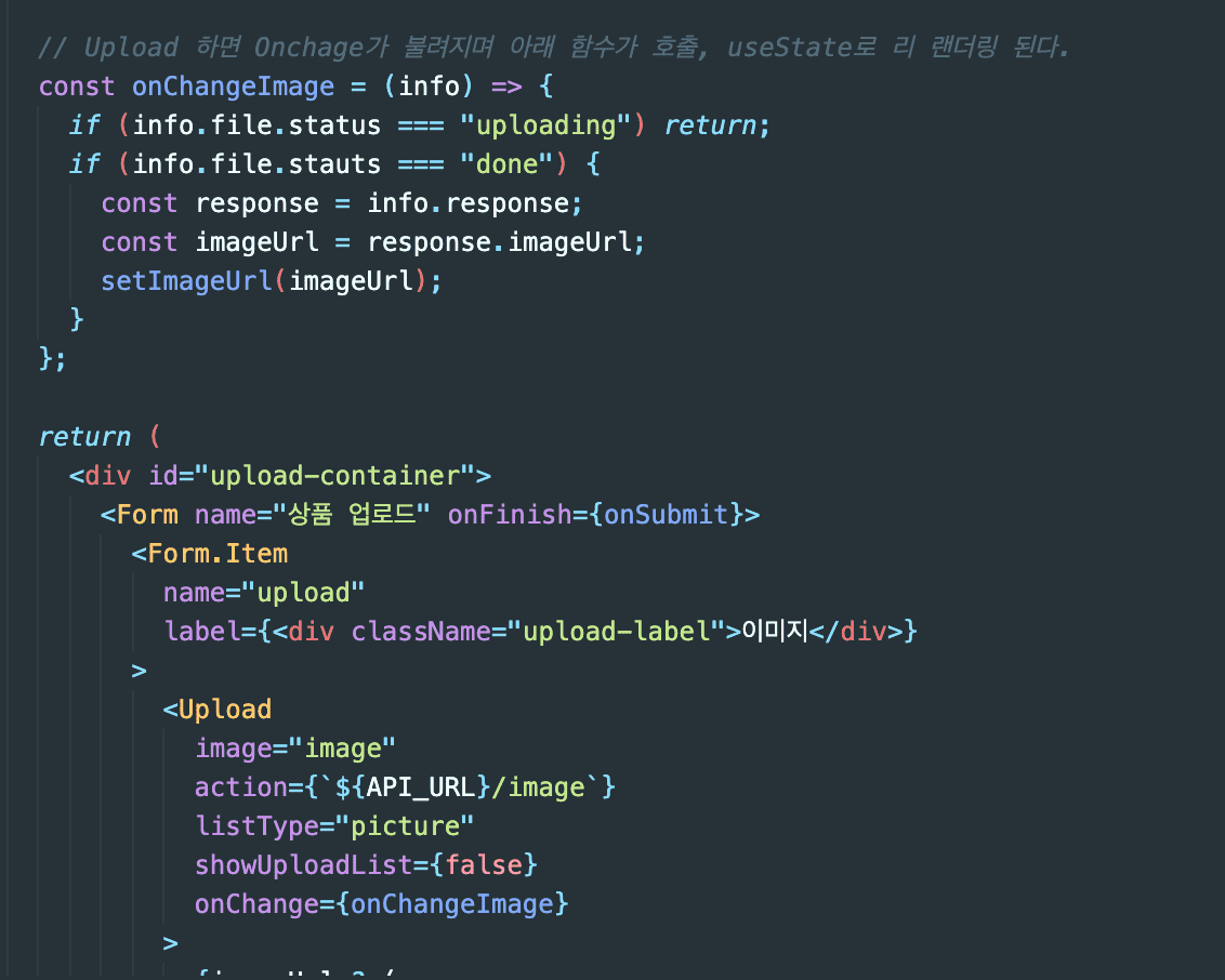Upload 컴포넌트 바로 아래에 image="image" -> name="image"로 바꿔서 해보시겠어요?
