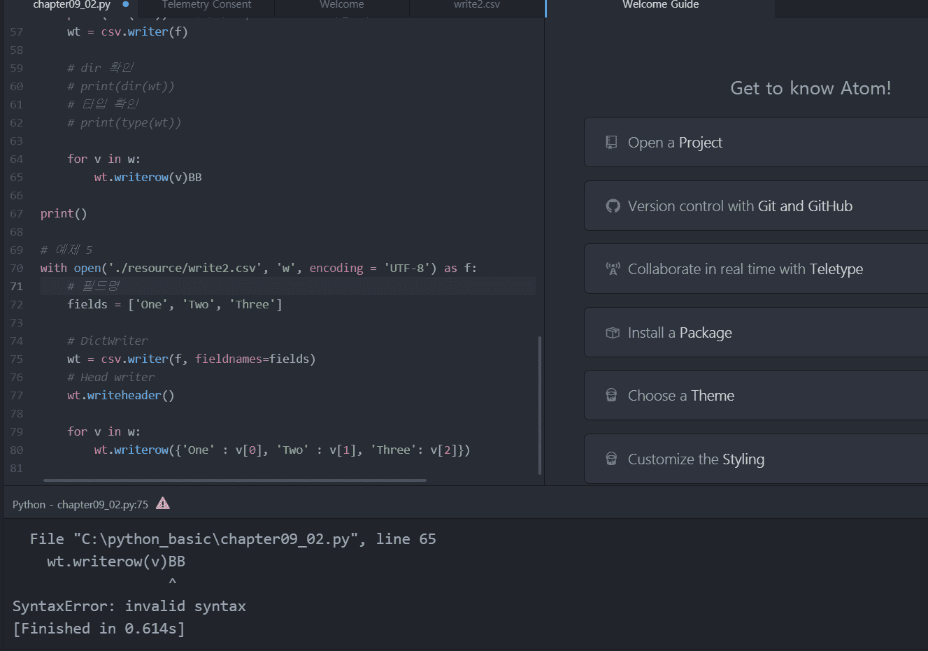 에러 메시지의 조언대로 wt.writerow(v) 뒤에 붙어있는 BB 를 지우신 후 다시 시도해보시기 바랍니다.