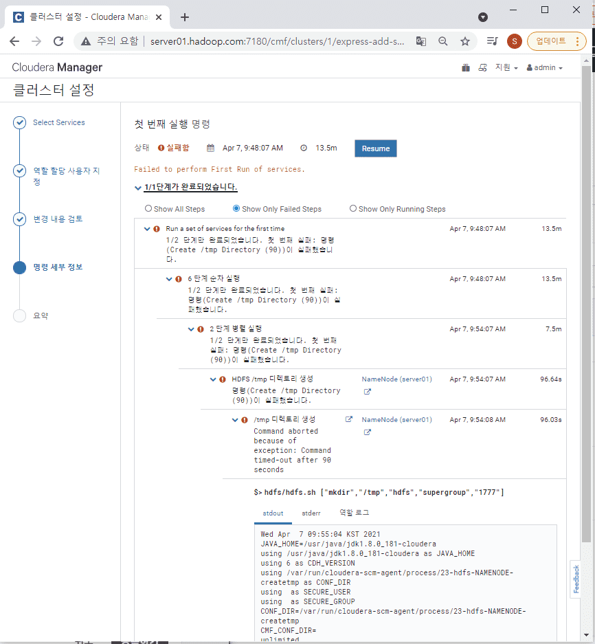 파일럿 프로젝트 초기 단계에 발생하는거로 봐서는 하둡 네임노드가 Safe Mode로 전환 된게 아닌가 싶습니다.