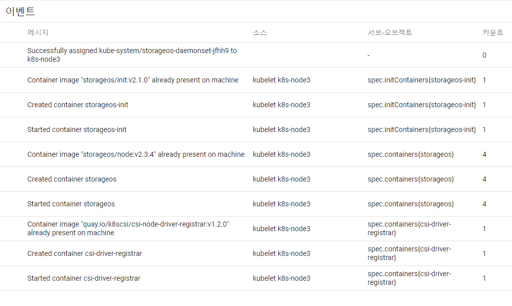 StorageOS설치하다 문제가 발생하였습니다. 상태를 보니 파트 이니셜라이징과 파드스케줄은 잘되었으나 컨테이너에 문제가 발생한듯합니다.
