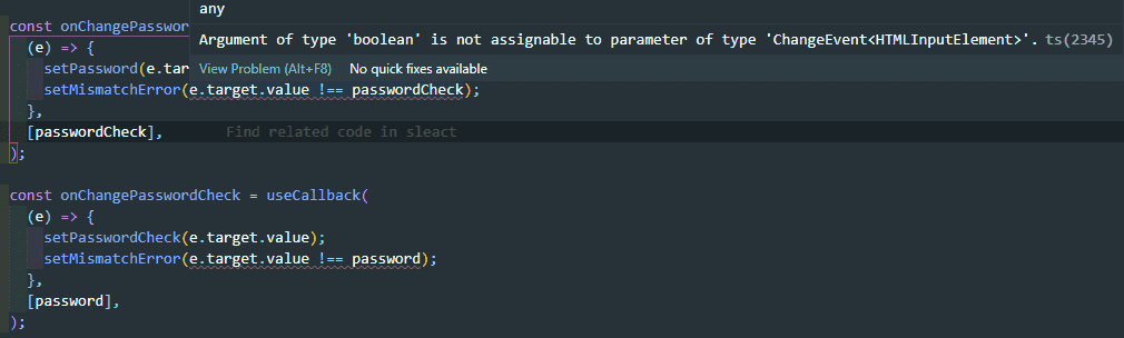 근데 저 에러는 왜 발생하는걸까요? useInputs 코드는 e:ChangeEvent<HTMLInputElement> 준거 외엔 똑같습니다 ㅜㅜ