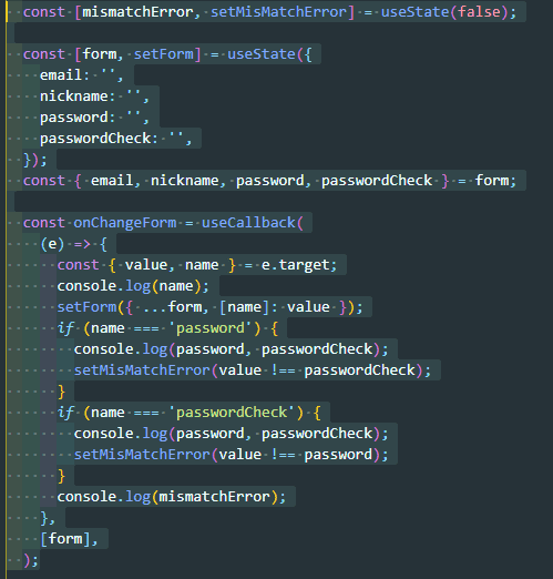 커스텀훅을 만들지 않고 form이라는 state안에서 정보들을 관리하게 해줬는데요, 굳이 따지자면 커스텀훅과 이 코드중에 뭐가 더 좋은 코드인가요? 전 아직 커스텀훅이 익숙하지 않아서.. 둘이 별 차이가 없다면 편한 방법으로 하고 싶어서요!