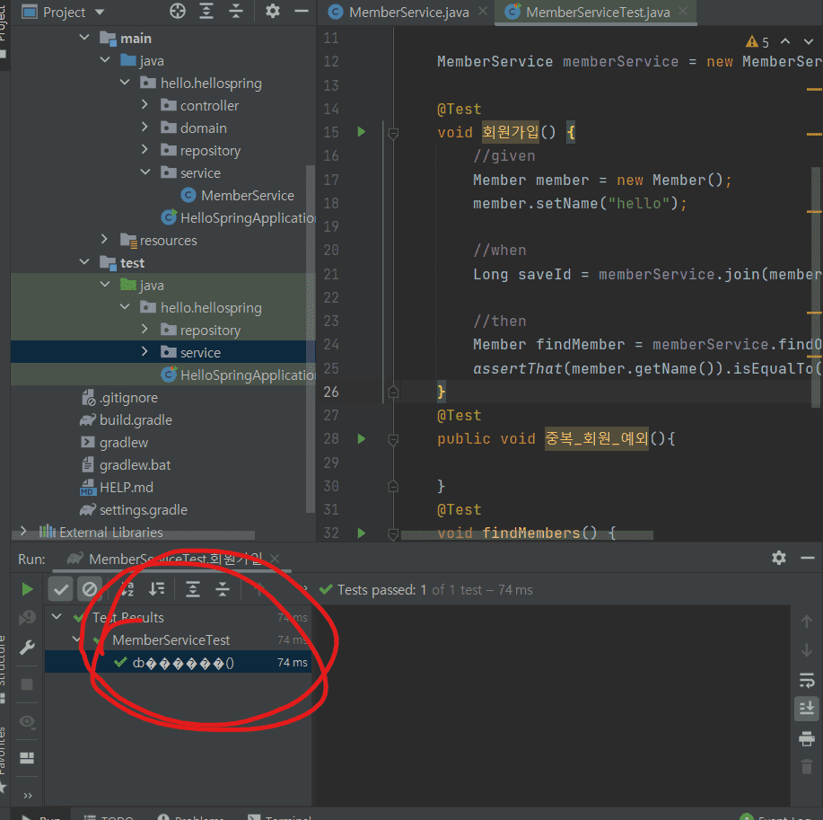 테스트 메소드명을 한글로 했는데 실행시키는 부분에서는