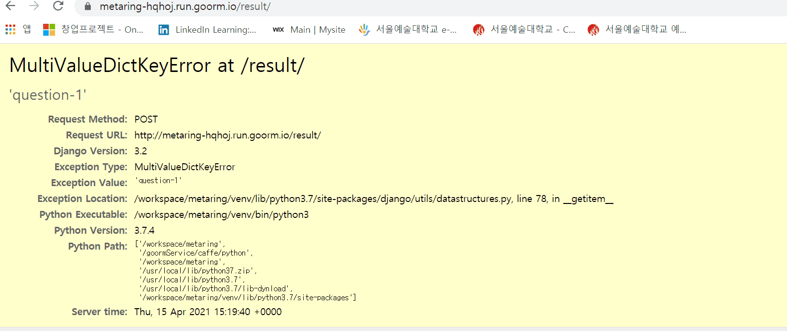views.py의 result 함수에서 request.POST를 print 해보시고 아래와 같이 'question-1' 키값이 들어가 있는지 확인해보세요.