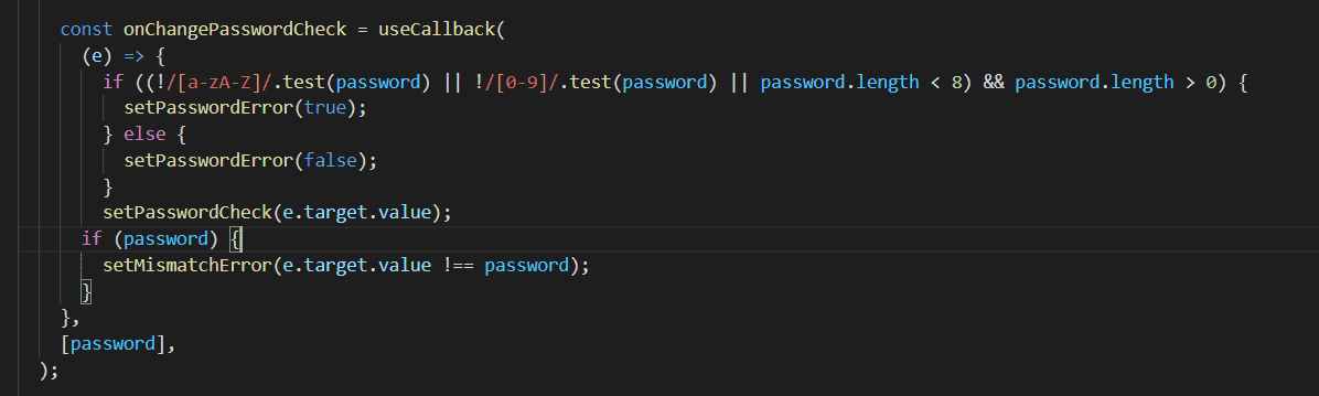 제가 이렇게 해준 이유는 우선 비밀번호에 조건을 달아주었는데요. 비밀번호 값을 입력했을때 조건에 맞지않으면 에러메시지를 띄워주는데 onChange에서 에러를 감지해주었을경우 비밀번호를 초기화해도 에러메시지는 남아있더라구요.