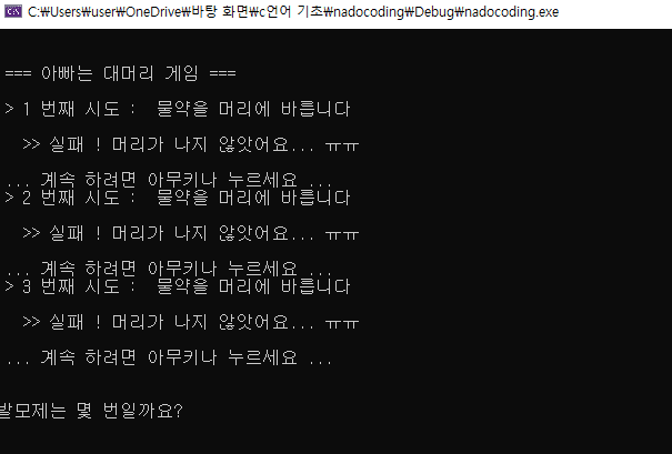 printf("\n\n발모제는 몇 번일까요? ");