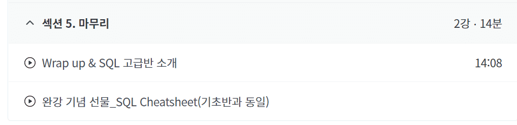 현재 백문이불여일타 SQL반 치트시트는 수강생분들의 편의를 위해 각 강의의 마지막 세션에 업로드 해두었습니다. 아래 해당 부분 이미지 첨부드리니 확인해보시고 해당 부분에서 치트시트 다운로드 받으시기바랍니다 :)