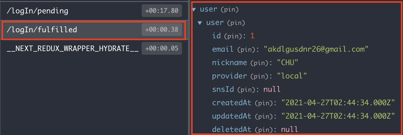 login / fulfilled되서 정보가 들어왔습니다. 그리고 데이터가 들어왔고, user에 데이터가 있다면