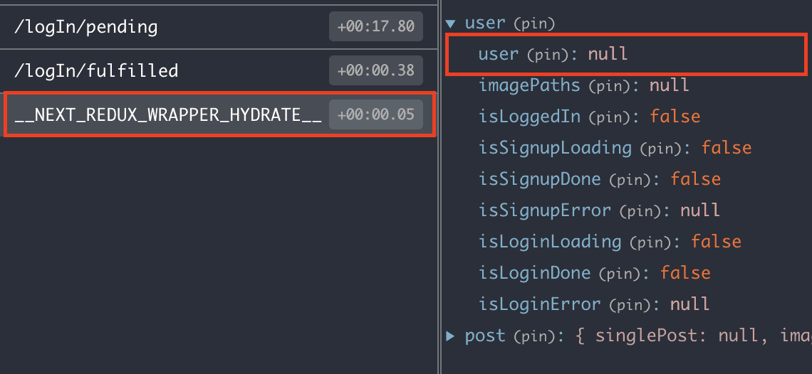 질문을 드린건 로그인 후 성공이 됐는데도 user에는 null로 되어있어서 확인해보니 2번째 줄 login에는 회원에 대한 정보가 나와있는데 index.json에서는 모든 state값이 null로 되어있어서요!